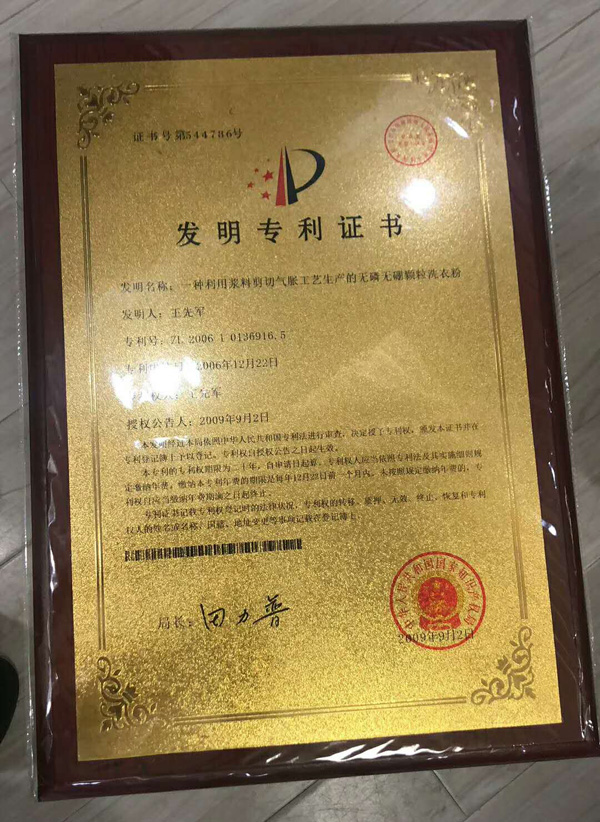 洗滌劑和車用尿素用戶的品質(zhì)保障,湖南富達日化頒發(fā)國家發(fā)明專利金色牌匾。