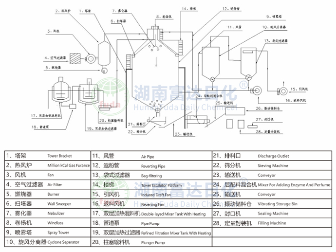 干燥塔(干燥塔體、塔承載加強(qiáng)圈、骨架、熱風(fēng)分布器、人孔檢修門、出風(fēng)管及清洗人孔、錐體氣錘、主塔支撐鋼架、進(jìn)塔熱風(fēng)管道、變徑連接管道、保溫材料、伴熱攪拌罐、電加熱、過濾器)、熱源系統(tǒng)(燃?xì)鉄犸L(fēng)爐)、鼓風(fēng)機(jī)(鼓風(fēng)機(jī)、初/中效空氣過濾器)、進(jìn)料泵、噴槍、高效旋風(fēng)分離器(高效旋風(fēng)分離器、旋風(fēng)出料閥、緩存料倉)、除塵系統(tǒng)(管道、布袋除塵器)、引風(fēng)機(jī)、控制系統(tǒng)(控制柜、變頻器、溫度傳感器、壓力傳感器)、輔助系統(tǒng)(欄桿、扶梯、現(xiàn)場電線電纜橋架、現(xiàn)場鋼架結(jié)構(gòu)平臺(tái)) |